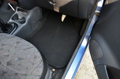Автоковрики ЕВА не впитывают, а удерживают грязь в ячейках. Вода не катается по полу, как в резиновых половичках, однако, её все равно видно. ЕВА удобны тем, что их легко достать не пролив и вытряхнуть. Они дешевле.