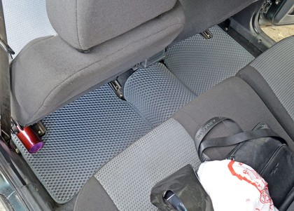Автоковрики ЕВА не впитывают, а удерживают грязь в ячейках. Вода не катается по полу, как в резиновых половичках, однако, её все равно видно. ЕВА удобны тем, что их легко достать не пролив и вытряхнуть. Они дешевле.